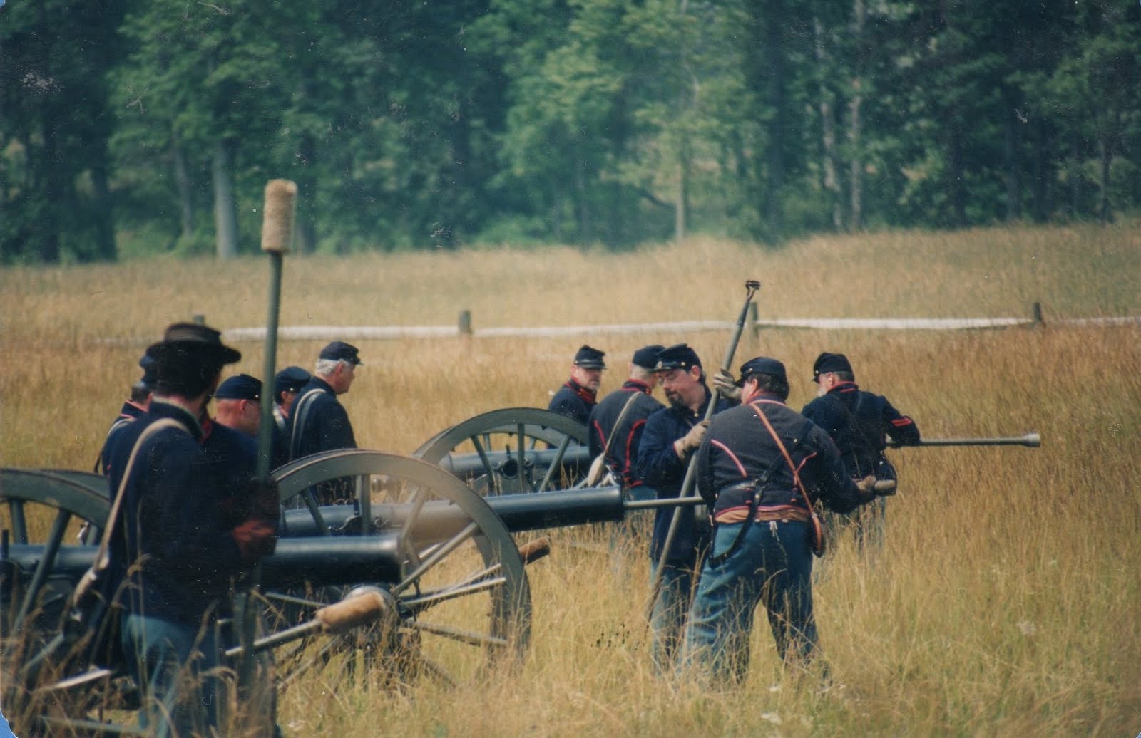 July 5  We got up and had breakfast at the hotel.  We then went to the battlefield.  We wanted to see the reenactors on the battlefield.  Our first stop was Pitzer Woods.  The Stonewall Brigade was there showing how their lines moved.  They also showed how skirmish lines worked.  I loved it.  We then went to the center of the Union Line at Cemetery Ridge.  A Pennsylvania Regiment was there.  They fired artillery and also showed agian how infantry lines moved and fired their muskets.  It was great.  While we were there I asked one of the reenactors there if we were allowed to walk across the Confederate High Water Mark field.  we could, so we went back to the Virginia Memorial and Dad and I walked across the field.  It was incredible to walk where Pickett's Charge happened.  We walked to the center of the union line and back.  Mom stayed in the car.  We then ate at a restaurant by our hotel for lunch.  Mom went back to the hotel to do laundry and take a nap while dad and I went to Lee's Headquarters in Gettysburg.  While I was there I bought some framed bullets fromt the battle of Fredericksburg, Virginia.  Actually my dad bought them for me.  We then drove back to the first day battle area.  I took a picture where General Reynolds was killed and also of the Peace Memorial.  We then went back into town where I bought my Union Belt Buckle.  After this we went back to the hotel and got mom.  We drove about ten miles to a place called Boyd's Bear Country.  They have all kinds of teddy bears there.  There was an encampment behind the barn, so I went and looked there while my parents went in.  When they were done, we drove back to Gettysburg and ate at a pizza place.  Across from the pizza place was a Lutheran Church.  They were giving a music program that night in the church so we went in.  It was very nice.  They sang Civil War songs, read accounts of how the church was used as a hospital during and after the battle, and also read poetry about the battle.  We all enjoyed it.  When we were done, we went for some ice-cream and then went back to the hotel and went to bed.